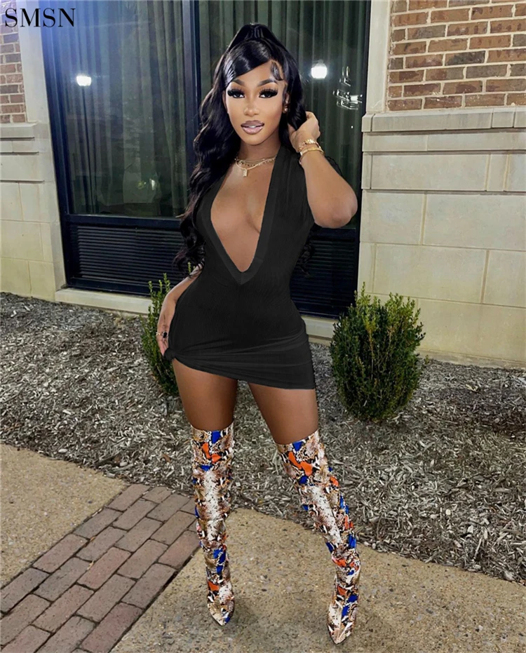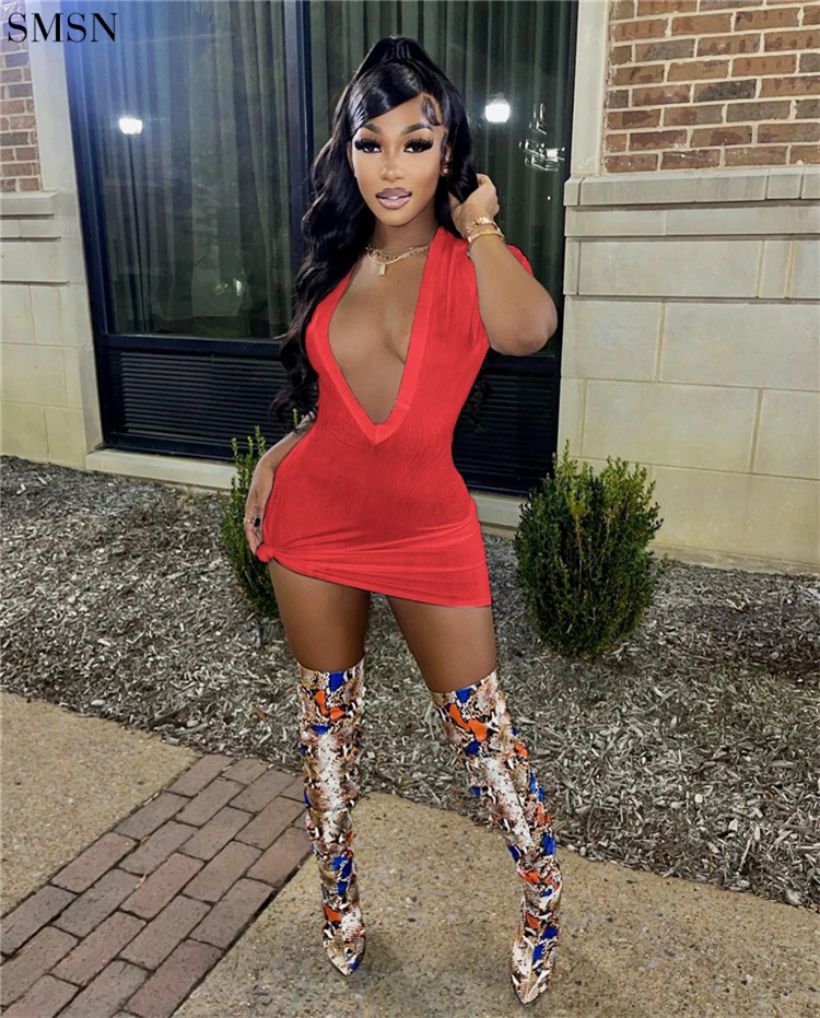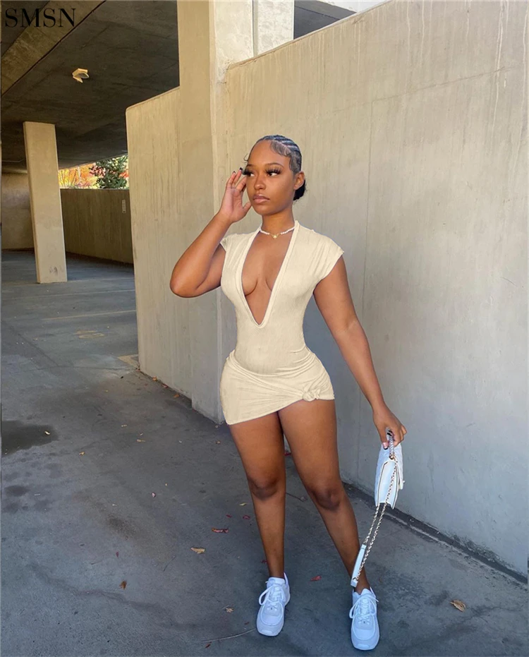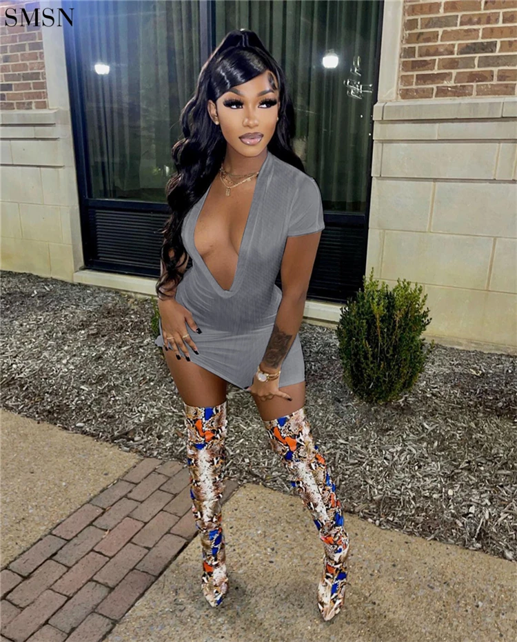 Woman Fashion Clothing Casual Deep V Sexy Dress Short Sleeve